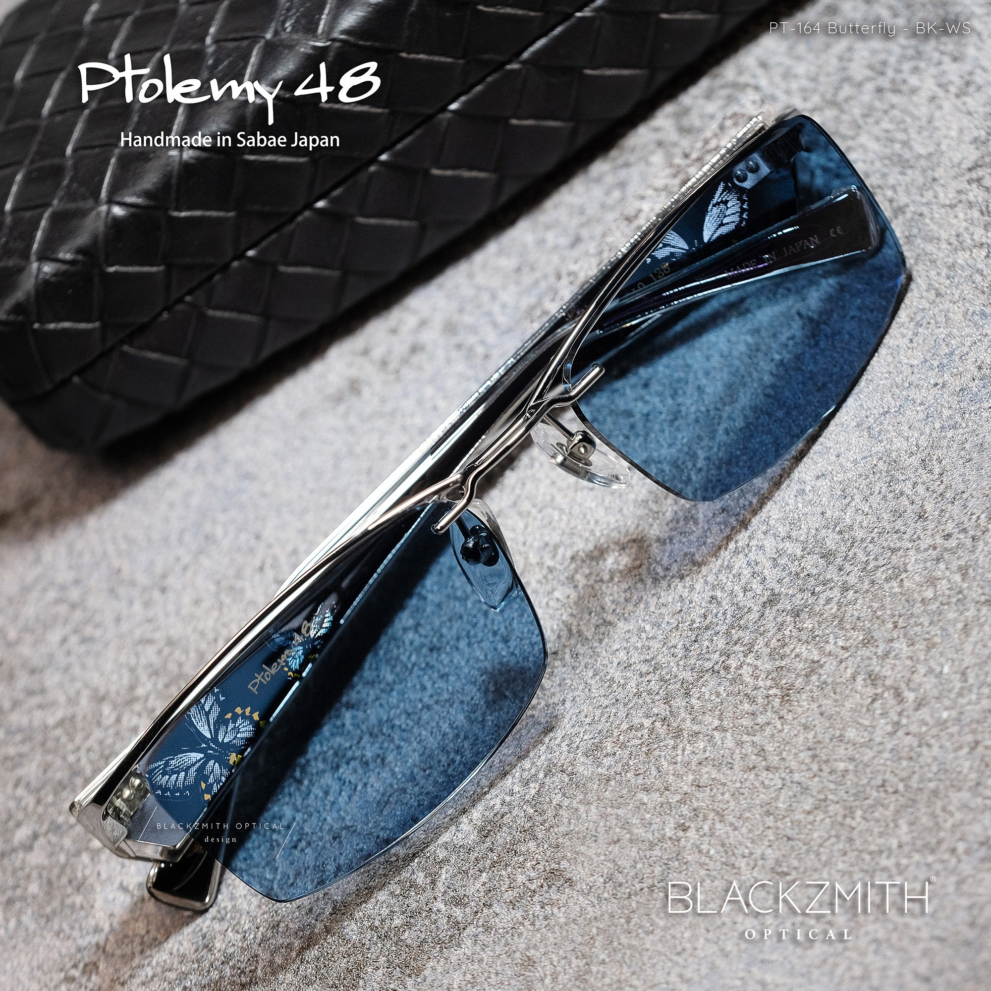 BLACKZMITH 香港限量首發的日本 Ptolemy 48 - PT-164 日本電繪刺青無框太陽眼鏡,備受矚目,以復古潮流的 Rimless 無框眼鏡設計,採用 Tint Colour 透色方形鏡片打造輪廓,富人工力學設計的上眉金屬支架牢牢緊扣鏡片,呈現懸空效果,相嵌連接亮點矚目的鏡臂,板材夾心壓層金屬薄片的靈獸圖騰。系列中富有四種不同御意,包括 :