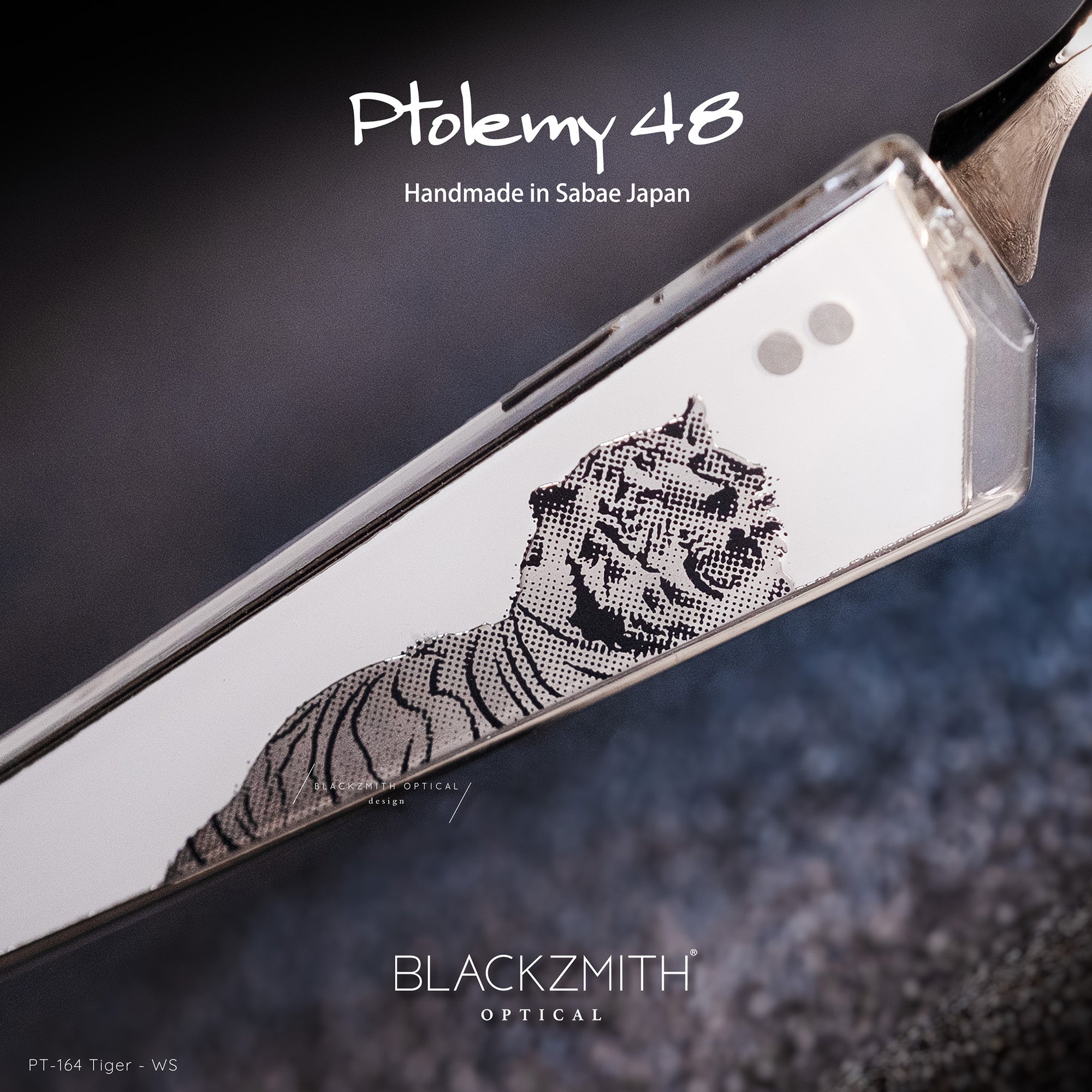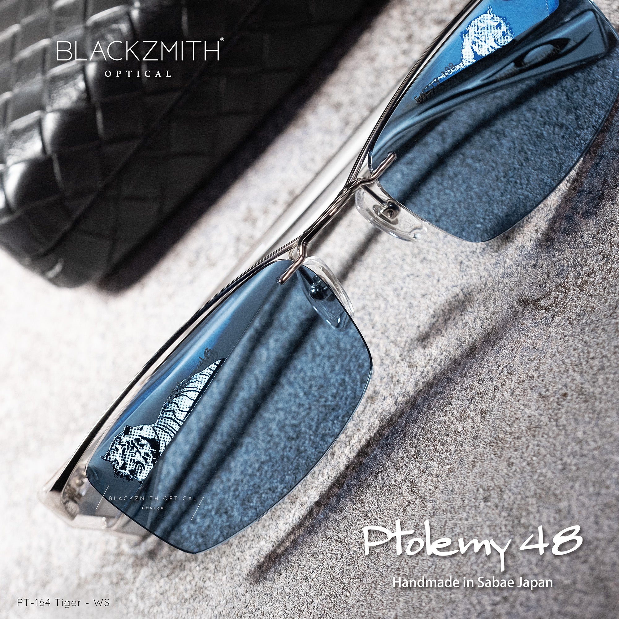 BLACKZMITH 香港限量首發的日本 Ptolemy 48 - PT-164 日本電繪刺青無框太陽眼鏡,備受矚目,以復古潮流的 Rimless 無框眼鏡設計,採用 Tint Colour 透色方形鏡片打造輪廓,富人工力學設計的上眉金屬支架牢牢緊扣鏡片,呈現懸空效果,相嵌連接亮點矚目的鏡臂,板材夾心壓層金屬薄片的靈獸圖騰。系列中富有四種不同御意,包括 :