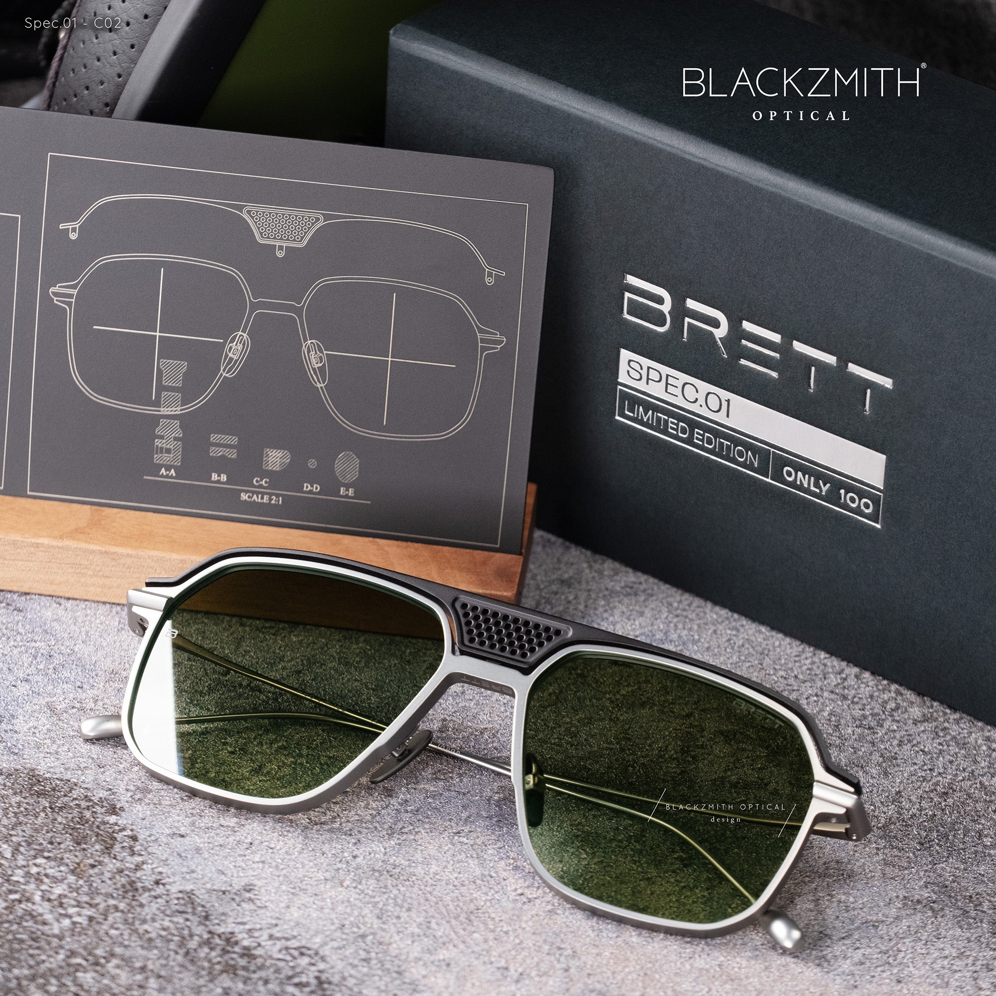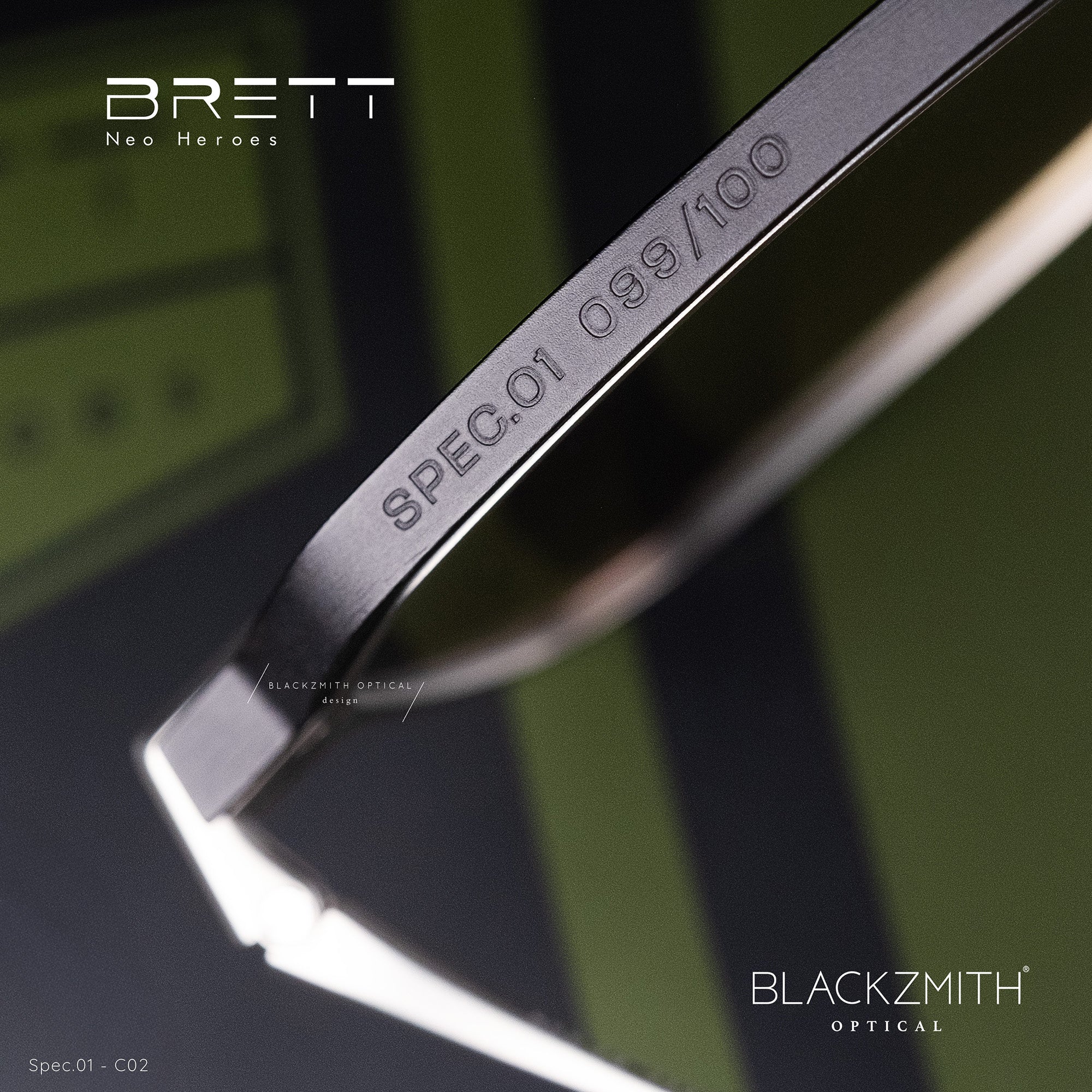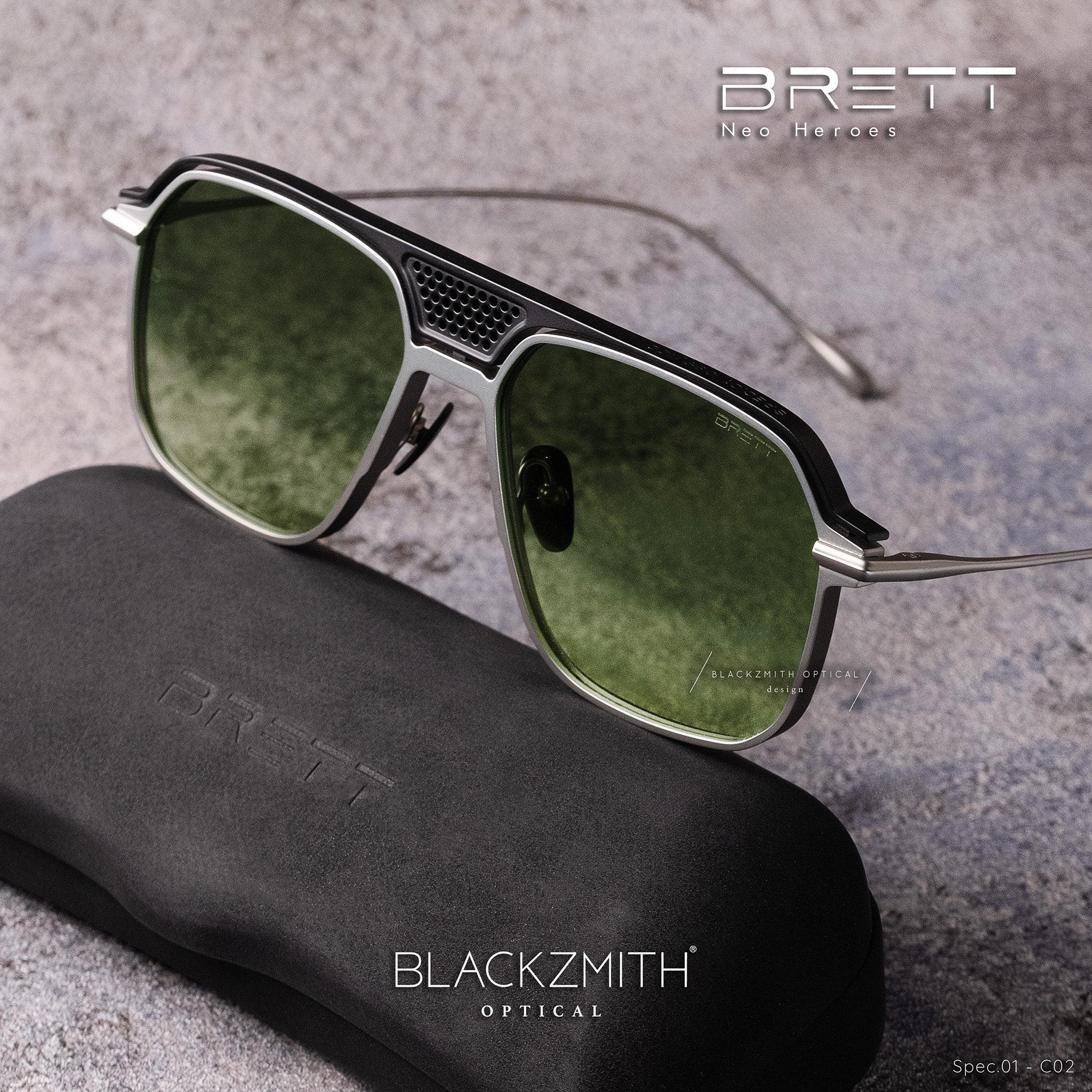 BRETT Neo Heroes - Spec.01 Limited Edition 太陽眼鏡限量僅推出 100枚,每副刻有獨特編號,獨一無二!Spec.01 方形鏡框以厚身銀色 Titanium 鑄造,切割分明硬朗,連接一體式眉樑,雙色配搭帥氣型格,中樑加入跑車元素設計,營造鏤空效果,帶出重金屬玩味。襯上刻有 BRETT 品牌標誌的 CR39 漸變綠色偏光太陽鏡片(Polarized Lenses),過濾刺眼強光與消除反射光線及色散,有效減低眼睛疲勞,提升視野舒適與清晣度,時刻讓雙眼保持輕鬆狀態,功能性與粗獷型格合一,處處細節盡顯日本職人的心思與精細工藝。每套更配原裝盒及有限量認證金屬牌,是個人品味與時尚象徵,極具珍藏價值!