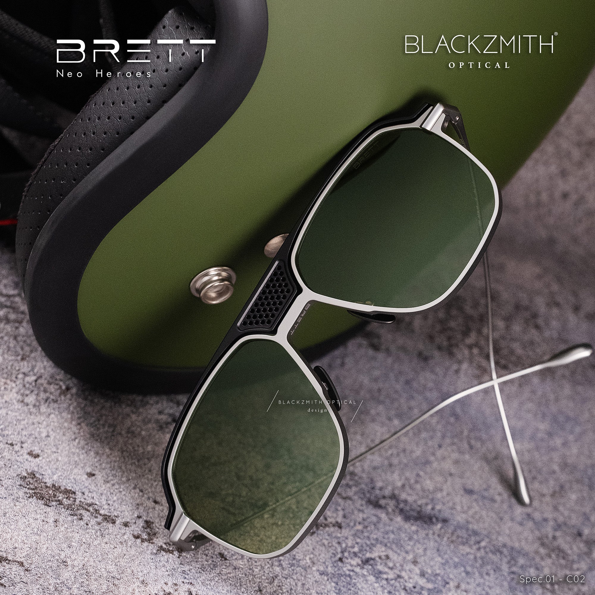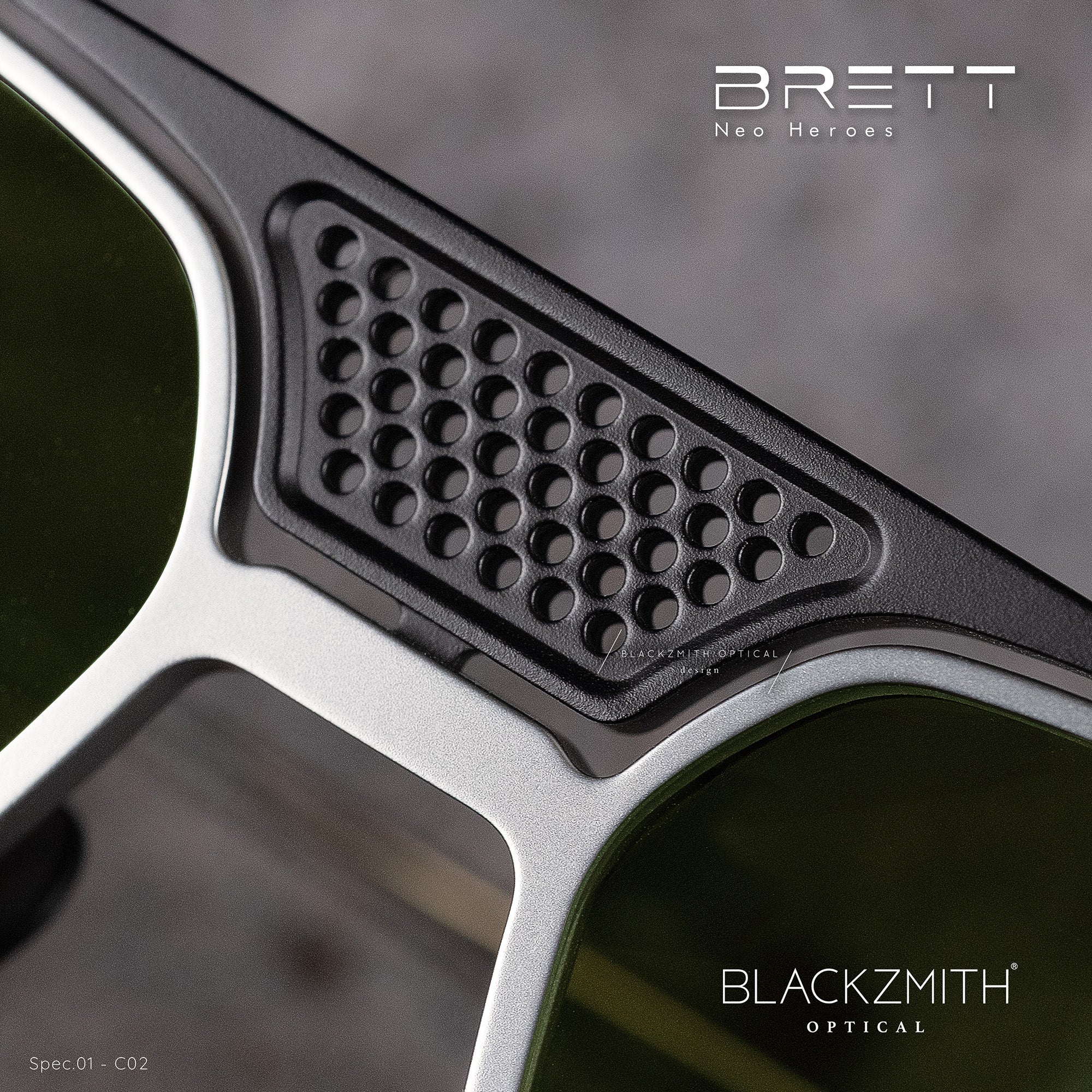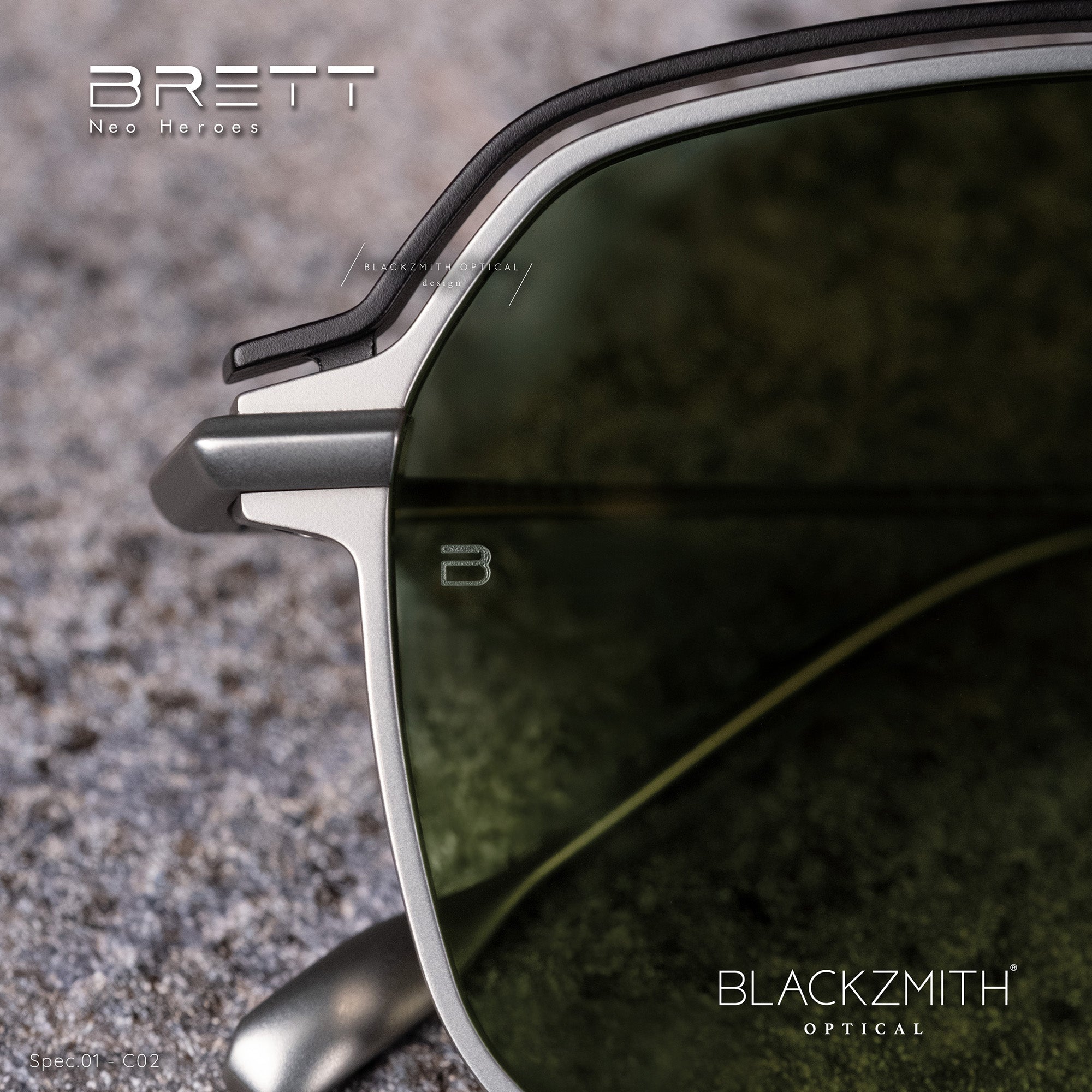 BRETT Neo Heroes - Spec.01 Limited Edition 太陽眼鏡限量僅推出 100枚,每副刻有獨特編號,獨一無二!Spec.01 方形鏡框以厚身銀色 Titanium 鑄造,切割分明硬朗,連接一體式眉樑,雙色配搭帥氣型格,中樑加入跑車元素設計,營造鏤空效果,帶出重金屬玩味。襯上刻有 BRETT 品牌標誌的 CR39 漸變綠色偏光太陽鏡片(Polarized Lenses),過濾刺眼強光與消除反射光線及色散,有效減低眼睛疲勞,提升視野舒適與清晣度,時刻讓雙眼保持輕鬆狀態,功能性與粗獷型格合一,處處細節盡顯日本職人的心思與精細工藝。每套更配原裝盒及有限量認證金屬牌,是個人品味與時尚象徵,極具珍藏價值!